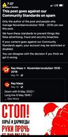 In late 2022, members of the Comintern (SH) where subjected to censorship on social media, particularly on the platforms of Facebook and Instagram, with a large amount of Stalinist-Hoxhaist content being taken down on labeled "spam", and the party symbol of the hammer-sickle-rifle[note 1] being branded as a "terrorist emblem". Other Comintern (SH) content on those platforms, especially those which were protesting the British monarchy, Zionism, and others were similarly removed.[4]