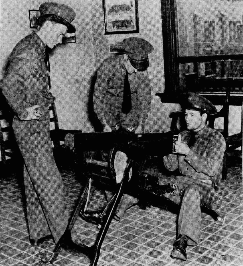 Recruiting is under way again for the 147th Infantry, Ohio National Guard. During the [First] World War the 147th fought in three campaigns in France. Above, a German machine gun [the MG 08], captured during that time. The young guardsmen are, left to right, Privates [William] Marshal Chaney, Joseph Loseto, and Jesse Calhoun [Chaney's 2nd cousin once removed]. (The Cincinnati Post, 17 July 1940, p. 17)