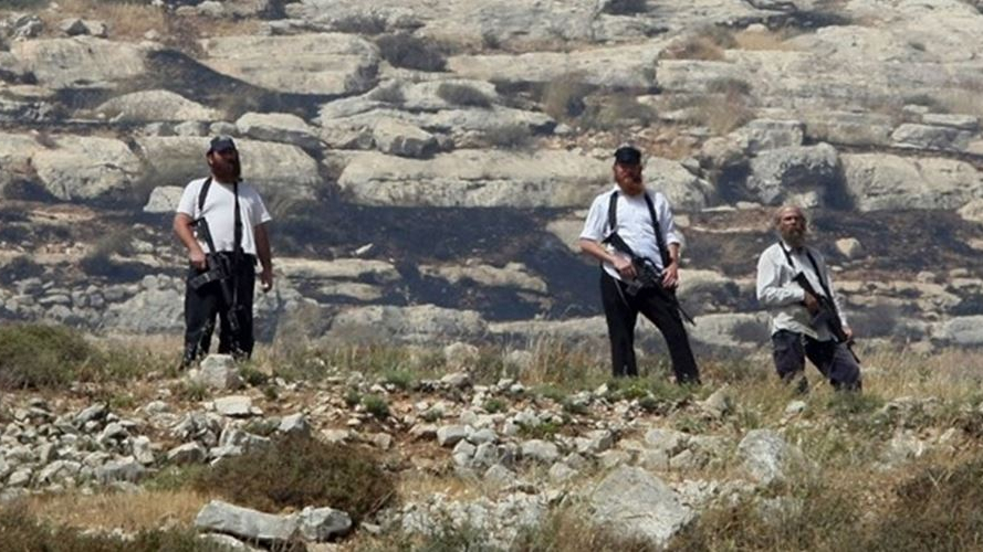 Three armed settlers of the "Yitzhar" settlement in occupied Palestine stand on a hill with their guns. Source: https://peoplesdispatch.org/2021/02/18/palestinian-human-rights-group-seeks-investigation-into-violence-from-illegal-yitzhar-settlement/