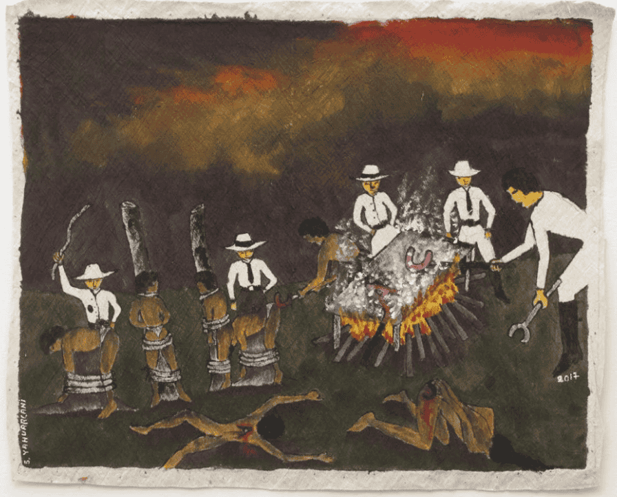 A 2017 painting from the series "Castigos del caucho" by Santiago Yahuarcani, whose grandfather was a survivor of the Putumayo genocide.