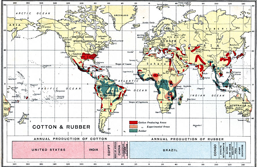 A 1915 world map highlighting regions of cotton production (shown in red) and rubber production (shown in blue). Also shows "experimental" cotton areas, highlighted in pink.