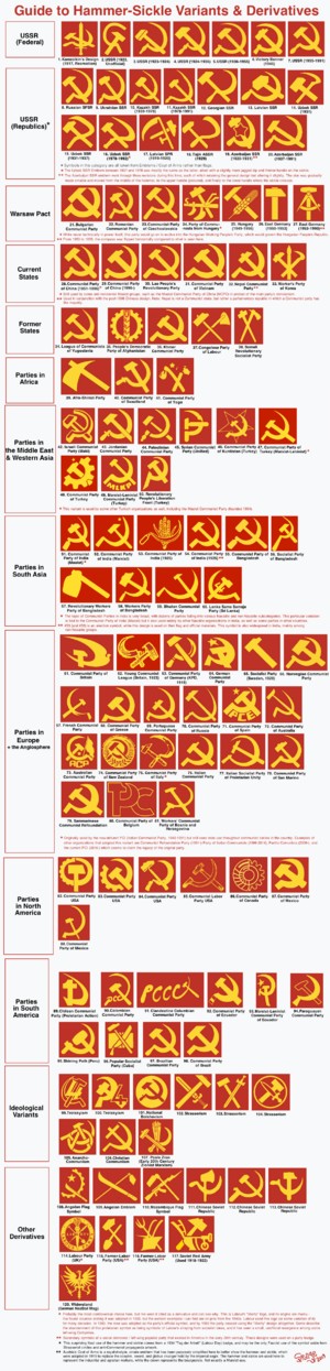 Different parties and countries have adapted the hammer and sickle to their conditions, including: