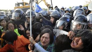 Anti-base activists opposed the base on several grounds. The first major controversy about the naval base project in Gangjeong was the way the construction plan was decided and how most villagers' voices were ignored. A meeting for approval of the naval base was illegally held, with only 87 out of 1,900 villagers participating in the meeting, and everything was passed without due process.[5][9] Later, Gangjeong villagers voted again on the naval base construction in Gangjeong village, this time with 725 villagers participating, and 680 villagers voted against naval base construction.[4] Secondly, the coastal area around Gangjeong was designated as a UNESCO biosphere reserve which the base's construction would endanger. Finally, the base was also opposed on the basis that the U.S. military would have the right to access and use it, as any Korean military bases under the Status of Forces Agreement (SOFA), effectively making it a U.S. base. The anger of the anti-base movement about this issue intensified in August 2011 when, under the orders of the national police chief, water cannons, police vehicles equipped with riot gear, and about six hundred police officers were dispatched to Gangjeong from the mainland in order to quell the protest against the base, a move which was likened to the previous suppression and state violence enacted on Jeju islanders in the past by the south Korean state seen during the Jeju uprising.[7]