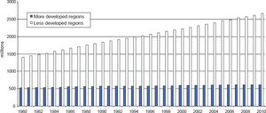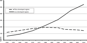 Between 1996, just before the Asian financial crisis, and 2006, [current account] imbalances increased roughly five times relative to world output. Three categories of large net capital exporters emerged: China and emerging Asia; aging high-income, export-oriented economies (Germany and Japan); and the oil exporters…. There also emerged just two groups of large net capital importers—the U.S. and "peripheral Europe"—Western, Southern and Eastern Europe.16