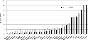 3. GLOBAL WAGE DIFFERENTIALS AND THE MYTH OF CONVERGENCE. As chapter 1 has revealed—and as chapters 2 and 3 will confirm—capitalists' lust for ultra-cheap labor-power is a fundamental determinant of the global shift of production. Chapter 5, "Global Wage Trends in the Neoliberal Era," attempts to bring global wage trends into focus, singling out three aspects for special attention: international wage differentials, growing in-country wage inequality, and the accelerating decline in labor's share of national income. Along the way, the accuracy and reliability of data on wages is questioned and found wanting, especially in low-wage countries. Calculation of real wages paid in domestic currency requires their conversion into "purchasing power parity"—adjusted dollars—thereby correcting for the failure of market exchange rates to equalize the purchasing power of "hard" and "soft" currencies. Since this adjustment is large and affects all international comparisons of wages, living standards and much else, it will be examined in some detail.