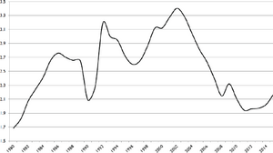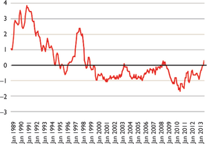 Inflation, too, was kept low by falling prices of intermediate inputs and consumer goods whose production was shifting to low-wage countries. How times change—as Financial Times columnist Gabriel Wildau commented, "cheap made-in-China goods contained price rises around the world when that was a force for good. Now, as Europe, Japan, and the United States struggle with stagnant or falling prices, the spectre of exported deflation is a far from benevolent force,"8 one that has helped push inflation below zero in Japan, the UK, and the Eurozone and is threatening to do so in the United States. This is greatly feared: negative inflation, that is, deflation, gives consumers an incentive to postpone purchases, makes the burden of debt heavier, and if falling prices were to become entrenched, would deal a final blow to hopes for a revival of capital investment. No one wants to invest in producing things whose prices are falling.
