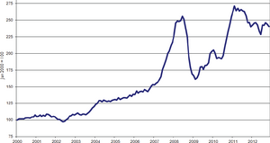 Volatility is the amount by which asset prices gyrate about their supposed equilibrium, and is related to correlation, the degree to which the prices of different types of assets move as a herd. Both measure the mood of serenity or panic among investors and both fell to extremely benign levels in the run-up to the crisis. Along with low interest rates, they also encouraged risk-taking behavior and more borrowing, and their quiescence was a key condition for the creation of the complex derivatives and highly leveraged speculative bets that characterized the pre-2007 financial feeding frenzy. Volatility and correlation were attenuated by the constant wall of dollars being recycled into the United States by China and other surplus countries—more than a billion dollars a day, day-in, day-out, for more than a decade. As Andrew Gamble has pointed out, "It was the cheapness of Chinese goods and its willingness to fund U.S. deficits which kept the bubble inflating as long as it did."9