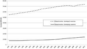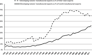 - ↑ Conventional trade statistics double-count imported inputs—for example, Bangladesh’s earnings from garment exports include the cost of the imported textiles that Bangladeshi garment workers fashion into clothes. As the share of intermediate inputs in total trade increases this distortion has grown ever larger. Statisticians at WTO and the OECD have forged new analytical tools and datasets capable of measuring, sector by sector, how much of a given country’s exports were actually generated in that country. Results from this enormous labor are presented in UNCTAD’s 2013 World Investment Report, which estimates that “today, some 28 percent of gross exports consist of value added that is first imported by countries only to be incorporated in products or services that are then exported again. Some $5 trillion of the $19 trillion in global gross exports (in 2010 figures) is double counted.”8 Illustrating this, China’s export performance is not quite so spectacular when full account is made of its export-processing regime, which allows imports for processing and re-export to enter duty-free. This trade accounts for more than half of China’s exports, and is mostly conducted by U.S., European, Taiwanese, and South Korean TNCs. Van Assche et al. found that in 2005 processed imports made up 90 percent of the value of China’s high-tech exports, compared to 50 percent in the mediumhigh-tech category and 30 percent in the low-tech category. In other words, the greater the sophistication of the goods being exported, the smaller the fraction of the export value actually added in China. Correcting for this distortion, China’s share of world trade in 2005 was 4.9 percent, more than a third lower than the 7.7 percent reported by World Bank and IMF data. Van Assche et al. comment, “China has turned into a global assembly platform that sources its processing inputs from its East Asian neighbors while sending its final goods to high-income countries. Since China is often only responsible for the final assembly of its export products, this puts into question China’s responsibility for the growing U.S. trade deficit.”9