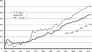 Despite a massive injection of public funds into the crippled banking system that raised Japanese government debt from 10 percent of GDP to over 180 percent, despite the relocation of labor-intensive production processes on a colossal scale to low-wage Asian neighbors, and despite booming growth in the rest of the world, Japan barely succeeded in keeping its head above the mire. Fear of what Financial Times journalist John Plender and others have called "Japanification" has now become rampant, as in a report of that title published by PIMCO, the world's largest investors in global bond markets: