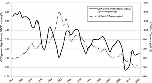 In Figure 10.2 "deflation" means falling prices; since GDP is merely the sum of the prices of all final goods, it can fall even if the volume of production stays the same or even increases GDP. The graph shows that GDP turned negative in 2009–2010, but this was primarily the effect of sharp cuts in the volume of production. "10-year U.S. Treasury yield" is the interest rate paid on ten-year bonds issued by the U.S. government. Rates on ten-year bonds issued by other imperialist governments are even lower—in mid-September 2015, yields were 0.3 percent on ten-year Japanese government bonds; 0.7 percent on the German bonds; 1 percent on French bonds; and 1.8 percent on Italian and UK bonds. The interest rate is the cost of money capital, and according to mainstream theory the equilibrium interest rate ensures that all savings are invested. It is related to the broadest definition of the rate of profit: the ratio between the total mass of surplus-value and the total quantity of capital. Its descent to historically low levels is therefore a sign of a deepening crisis of profitability, which is a different way of saying a crisis of capitalism.