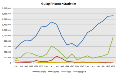 There were 510,307 GULag prisoners in 1934, including 127,000 to 170,000 political prisoners. The number of prisoners rose to 1,317,195 in 1939, and there were about 116,000 deaths in the camps.[3]