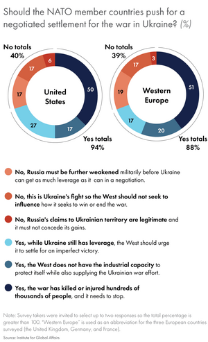 79% of French people blame the USA and/or NATO for starting the war, and 46% blame Putin or Russia. In Germany, 51% of people blame the USA or NATO and 29% blame Putin or Russia. The French poll allowed people to blame both sides, but the German poll only allowed one choice.[50]