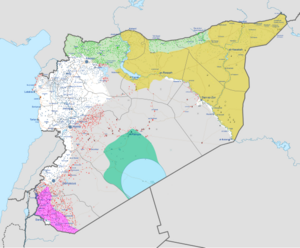 Situation as of December 18, 2024 HTS (white), SFA (green), SIG (light green), Rojava (yellow), SOR (pink), Israel (blue) | |||||||||